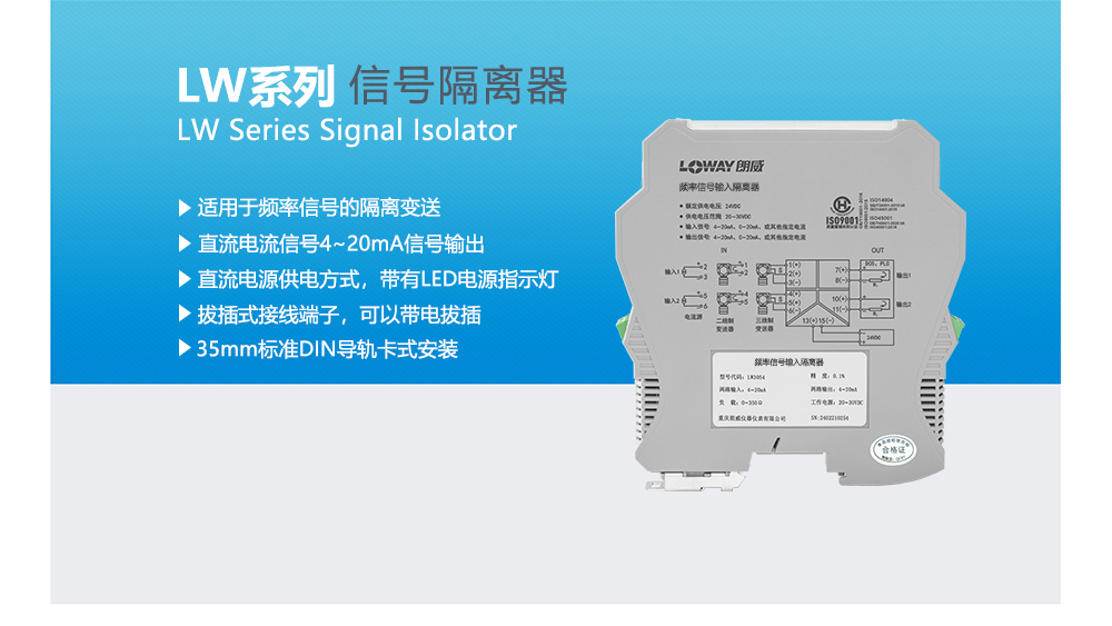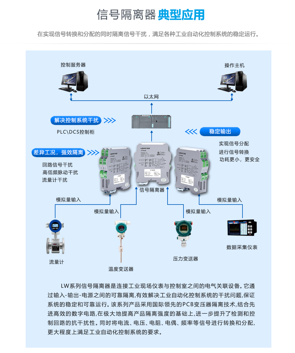 信號隔離器對現(xiàn)場和控制室設(shè)備之間的信號進(jìn)?隔離傳輸,實(shí)現(xiàn)不同信號的相互轉(zhuǎn)換。給?、三線制變送器提供隔離的直流電源,并檢測來?變送器的4~20mA電流信號,經(jīng)過隔離、抗?擾抑制等處理后,向控制系統(tǒng)或其他單元組合儀表輸出直流電流或電壓信號。該信號隔離器采?直流電源供電,輸?-輸出-電源三端離。能抑制共模、串模?擾、尖峰脈沖,使控制系統(tǒng)的信號傳輸更定可靠。